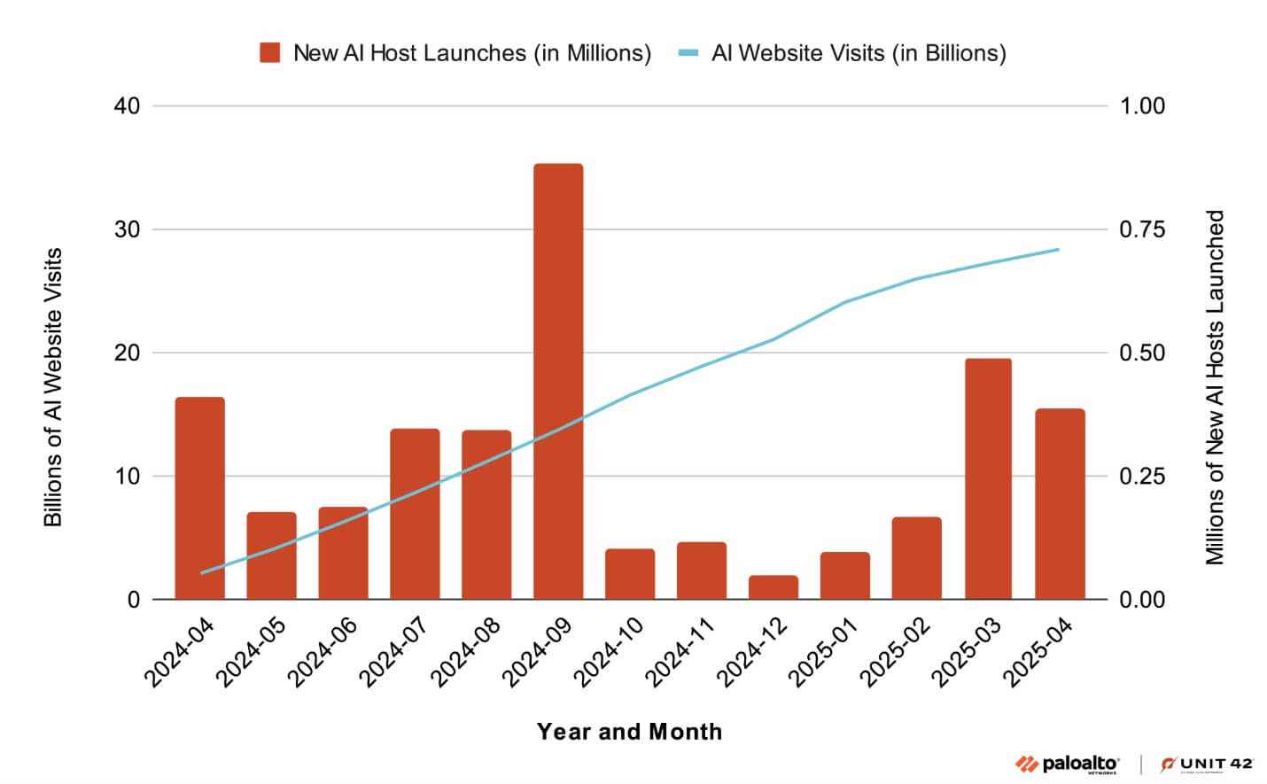 Además, los datos de telemetría de Unit 42 muestran que entre abril de 2024 y abril de 2025 el tráfico hacia plataformas GenAI ha crecido de forma constante, con repuntes destacados en septiembre de 2024 y marzo de 2025. En paralelo, el número de sitios que integran servicios de IA también ha aumentado de forma significativa, ampliando el ecosistema y con él, la superficie de exposición a ciberamenazas.